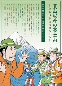富士山の夏山期間は7月上旬から9月上旬ですが、夏山期間以外の厳しい気象条件の下、登山を行う利用者が見られ、毎年多くの遭難事故が発生しています。このため、遭難事故防止および自然環境を保全するための「富士登山における安全確保のためのガイドライン(夏山期間も含む)」が策定されました。当協議会ではリーフレットやポスターを作成し、ガイドラインの普及に努めています。