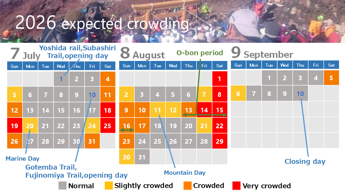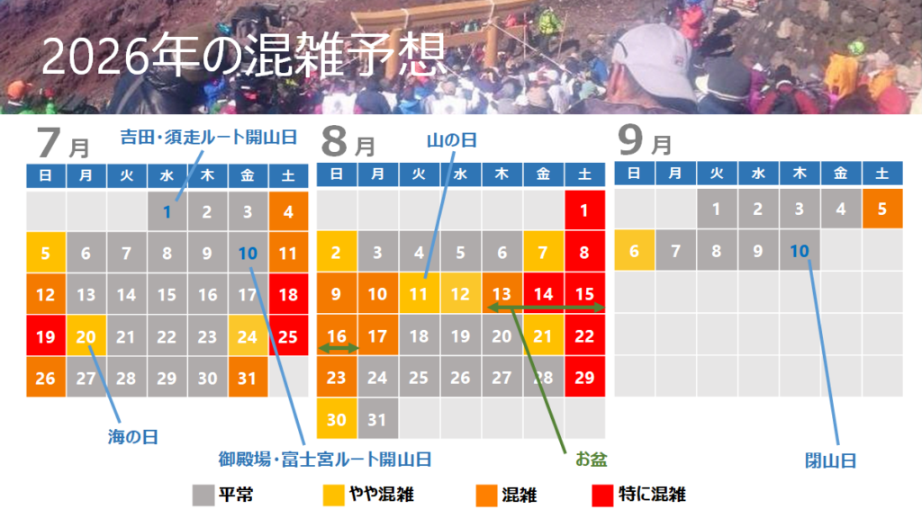 カレンダーの「特に混雑」する日には、御来光前の山頂直下の登山道では渋滞で思うように進めないことも予想されます。