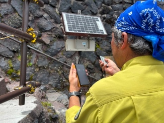 登山者カウンターの点検とデータ回収 (八合目にて)