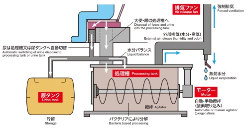 最初にウンチとオシッコに物理的に分離され、ウンチは処理槽に、オシッコは尿タンクに溜ります。ウンチについては90%以上は水分のため、まず菌床(そば殻)に水分を吸わせて蒸発し易い環境にします。その上で、ヒーターで温度管理をしながら、槽内のスクリューで撹拌し、酸素を取り込みます。適切な温度と十分な空気を保つことによって、好気性バクテリアの活動を活発化させていきます。