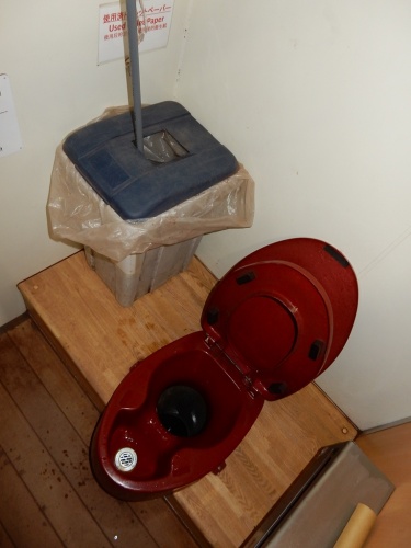 その前に、まず便器から。便座を上げるとオシッコの入る穴とウンチが落ちる穴が分かれていることが分かります。入口の段階から分けているのですね。それから、これは山のトイレの常識なのですが、紙は自然界ではなかなか分解しづらく、またティッシュなどものによっては分解しないものもあるため、使用済のトイレットペーパーは便器の中に落とすのではなく、脇のボックスに入れ備え付けの棒で奥に押し込んで下さい。(紙は纏めて焼却処分されます)