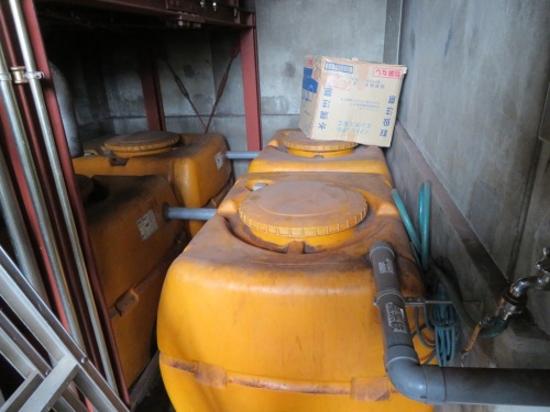 次に機械室に入って階段を下ると大きな4連の黄色いタンクが並んでいます。尿タンクです。さっきのオシッコの穴と男子用小便器から来たオシッコがここに溜まります。