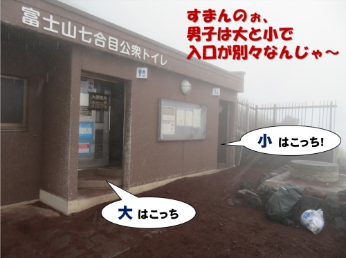 これは男子諸君にお願いしたい事。吉田ルート下山道トイレは建物の構造上、男子の大と小が別々の部屋になっていて入口が別です。オシッコだけなら小便用のトイレを使って欲しいのです。個室で立ち小便をするとウンチの方の処理槽の方に入ってしまうので、処理槽の水分量が多くなりすぎて、バクテリアによる分解が進まなくなってしまうからです。