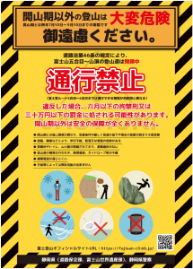 違反した場合、六月以下の拘禁刑または三十万円以下の罰金に処される可能性があります。 開山期以外の富士登山は大変危険です。