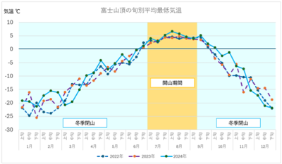 グラフは富士山頂における2022年~2024年の日最低気温(旬平均)の推移を示しています。これを見ると、閉山中のほとんどは氷点下であり、特に11月から翌4月にかけては、マイナス10℃以下の極寒であることが分かります。それ以外の期間では気温が緩むように見えますが、5~6月は気温の上昇により雪崩や滑落の危険があり、9~10月は台風や秋の長雨などと相まって低体温症を引き起こす危険が極めて高くなります。