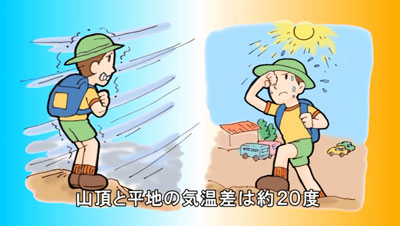 - 五合目と山頂との標高差があるため、気温差が大きく(標高差100m毎に約-0.6℃)、山頂では夏でも真冬並みの気温となります。また、同じ気温でも風が吹くと体感温度が下がります(風速1m毎に約-1.0℃)。